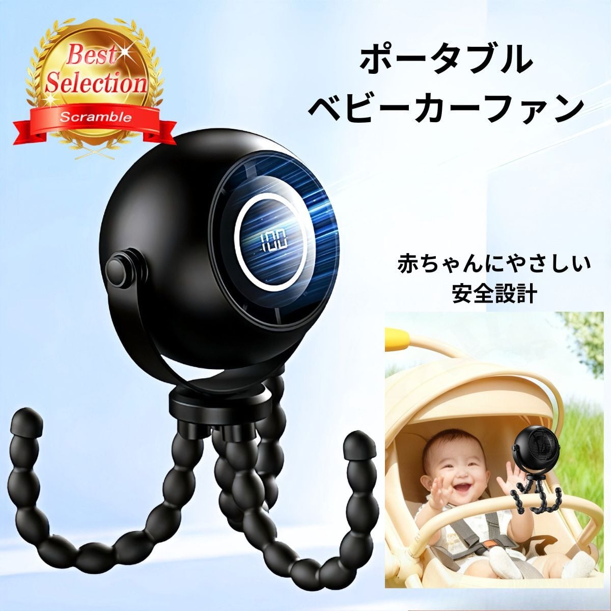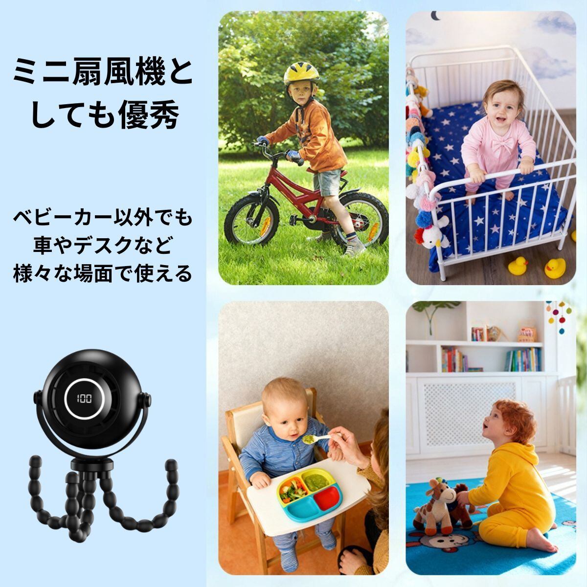 ベビーカーや車内、チャイルドシートなどに簡単に固定でき、外出時の暑さ対策に最適です。