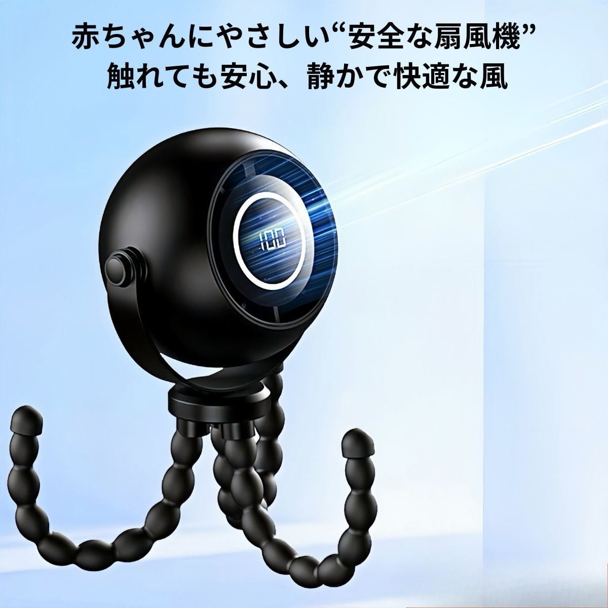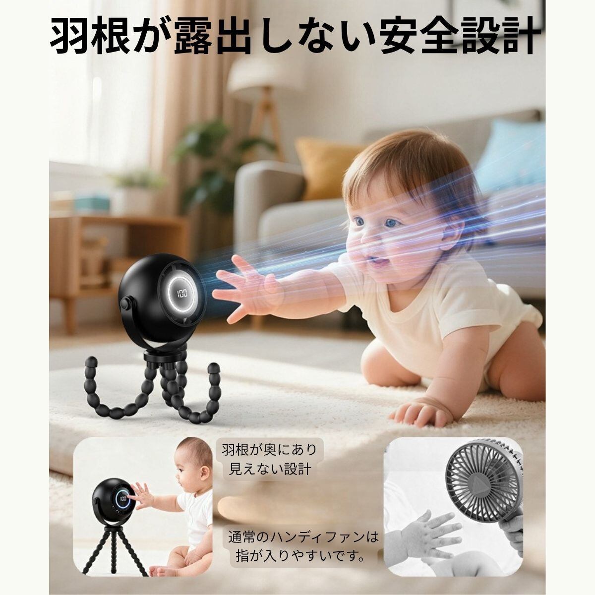 指を入れにくい構造で安心して使えます。静音設計で寝かしつけ中も音が気にならず、やさしい風で快適。
