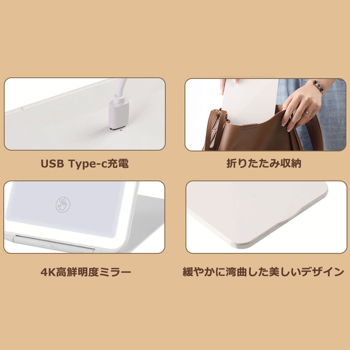 女優ミラー 手鏡 卓上 LED ライト 鏡 充電式 旅行 メイク おしゃれ かわいい USB 化粧 小型 薄型 折りたたみ 持ち運び